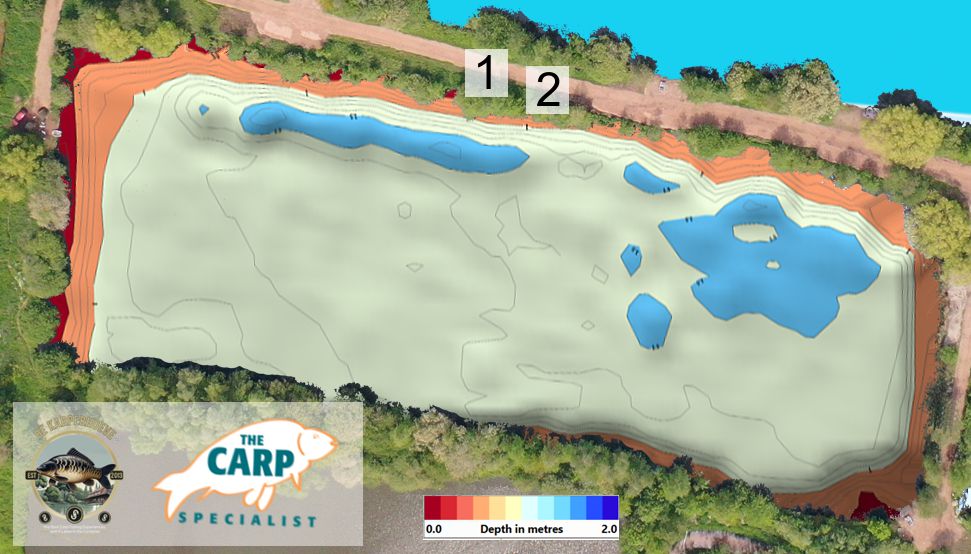 Diepte kaart van Tines lake op de karperhoeve, deze kaart wordt zichtbaar in je Carplounge Tablet zodra je met internet verbonden bent zie je hem gedeeld worden in je Account op de Tablet